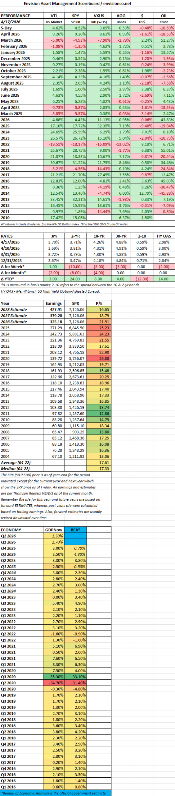 - US stocks -0.44%, international +0.53%, bonds +0.50%.